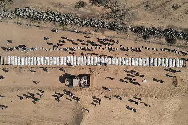 At Nasser Hospital, civil defense workers and medical staff did what families could not — they prepared the dead. The line of body bags was not a news graphic. It was a procession. With no confirmed identities, with tags but not names, Gaza dug a mass grave and lowered 54 people into the earth, each a story cut short, each a family now trapped between hope and the finality of numbered dirt.