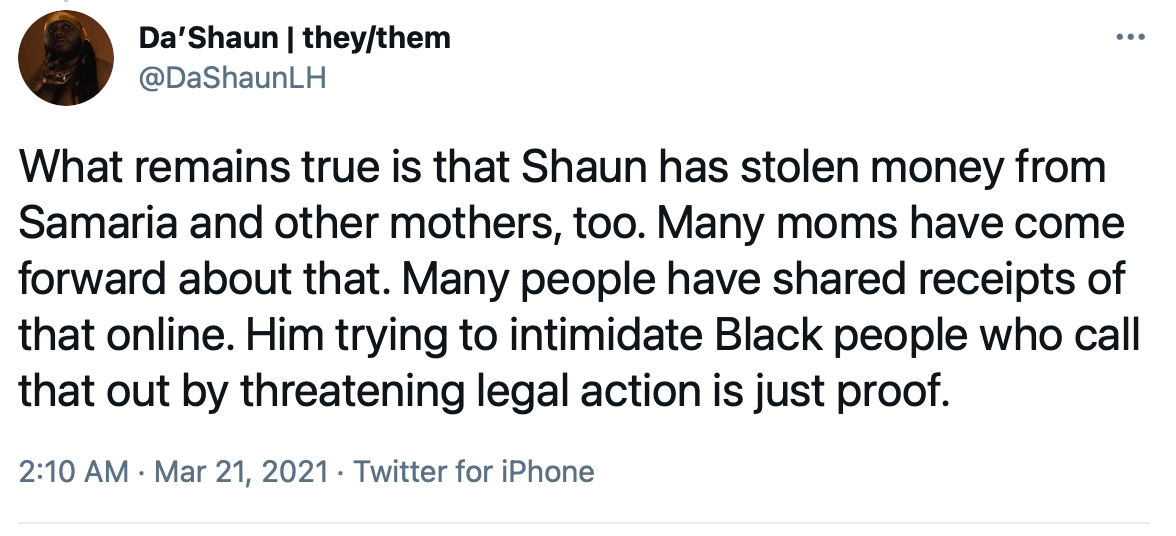 No, I’ve never stolen money from Samaria Rice - ever. I’ve never stolen money from ANY MOTHER. Not a single mother has come forward about that. Not a single person has shared receipts about this. All fabrications. That tweet above also went viral.