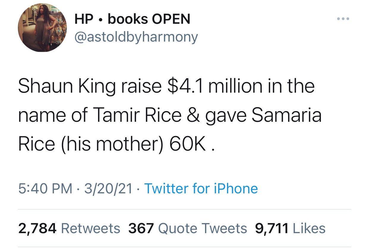 Secondly, I never “gave” the family anything. I never possessed a single penny raised for this family. Ever. The courts seized the money we raised in 2014 and her first attorneys took a good deal of it for themselves. The courts then split the remaining money from that fundraiser and the second one between Samaria and Tamir’s father and gave it back to her in installments of their choosing. In a recent interview with New York Magazine, Samaria said “Shaun King raised all that money for Tamir and sent me a $60,000 check.”