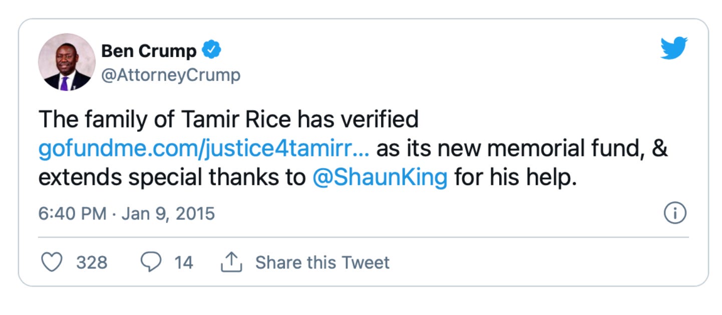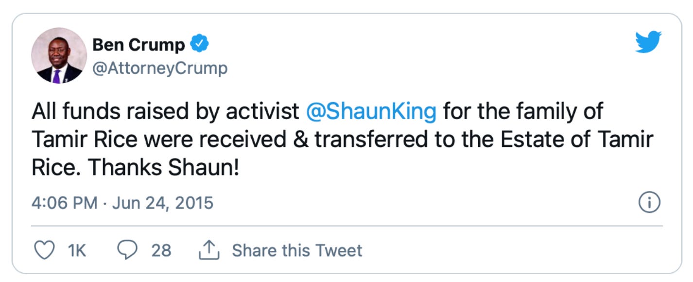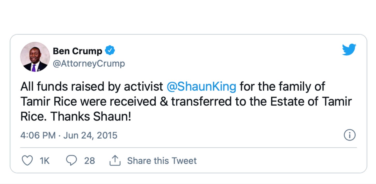 On June 24th of 2015, Crump again tweeted that every dollar I raised for the family, in the first fundraiser and in the second one, was “received and transferred to the estate of Tamir Rice.” At that point, I truly thought all of the lies would go away.