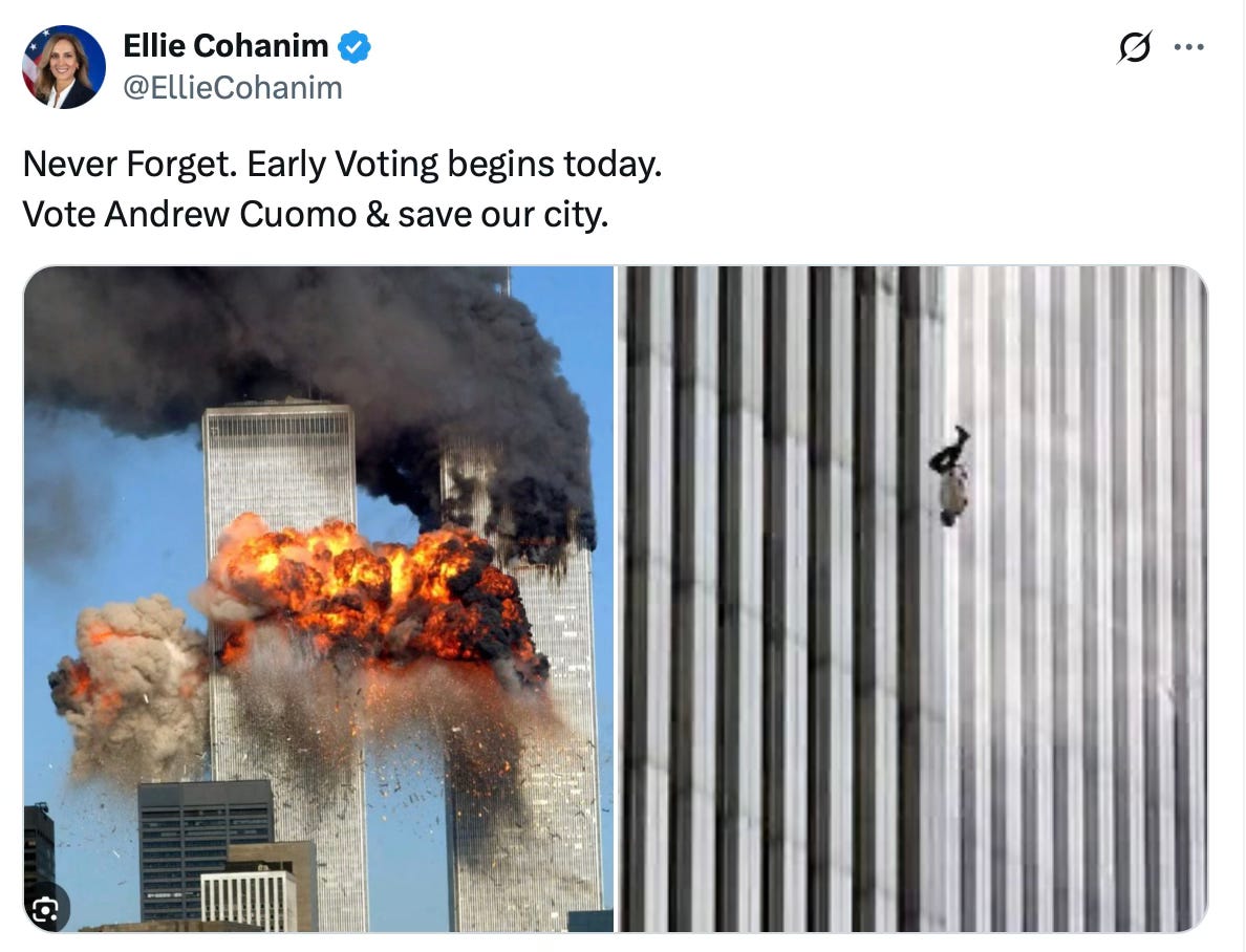 Ellie Cohanim hit “post” and tried to borrow New York’s deepest wound to win a news cycle. Her despicable tweet pairs two images from 9/11—the North Tower fireball and the Falling Man—with a line urging New Yorkers to vote against Zohran Mamdani, who is Muslim and who now leads the mayoral race. The message is unmistakable: Put a Muslim in City Hall and you’ll bring this back.