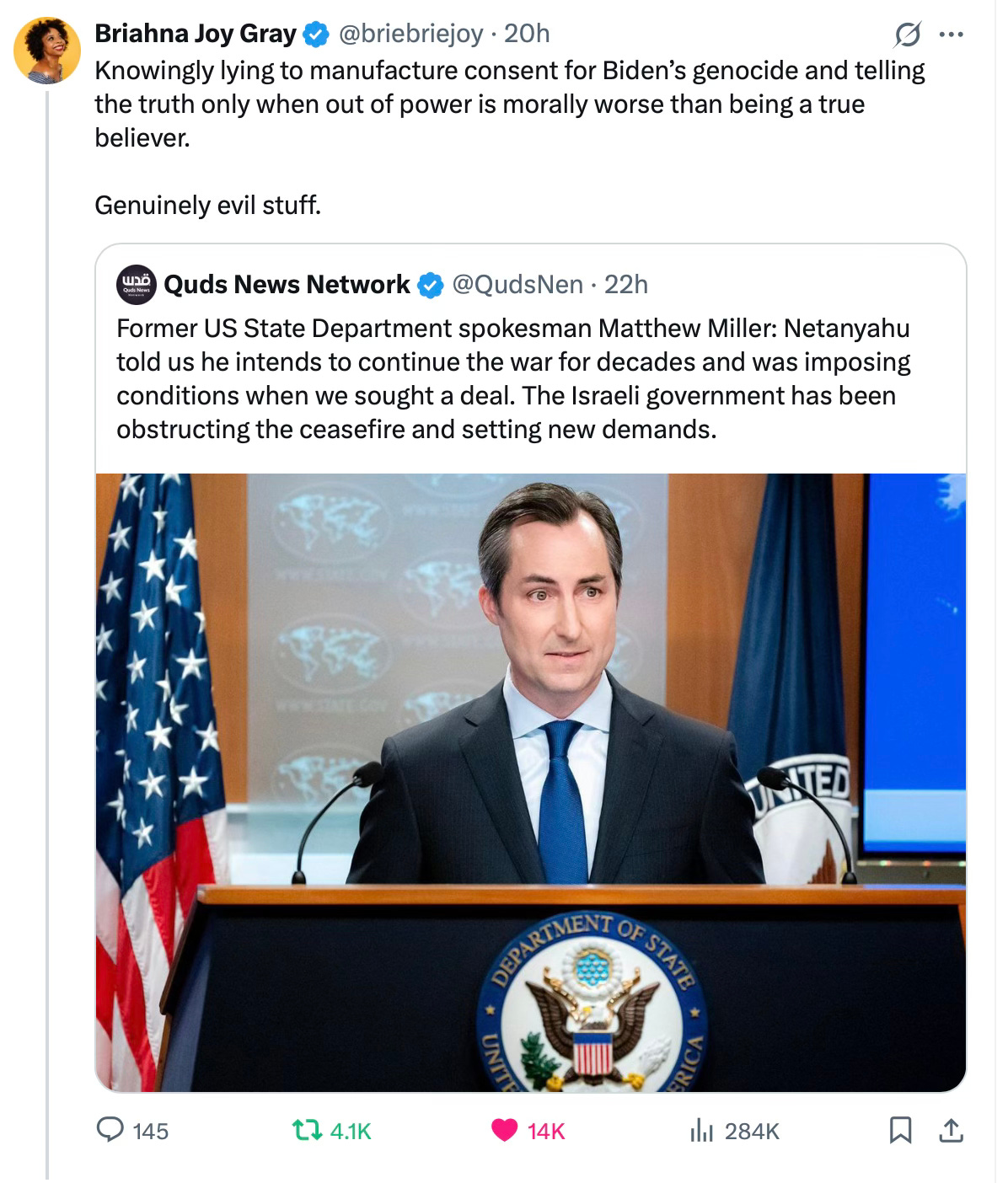 That’s exactly right. A true believer is deluded. But Matthew Miller was not deluded. He knew. He saw the sabotage. He knew Netanyahu was blocking deals. He knew the famine was real. He knew the genocide was deliberate. And he chose to lie to the world anyway.