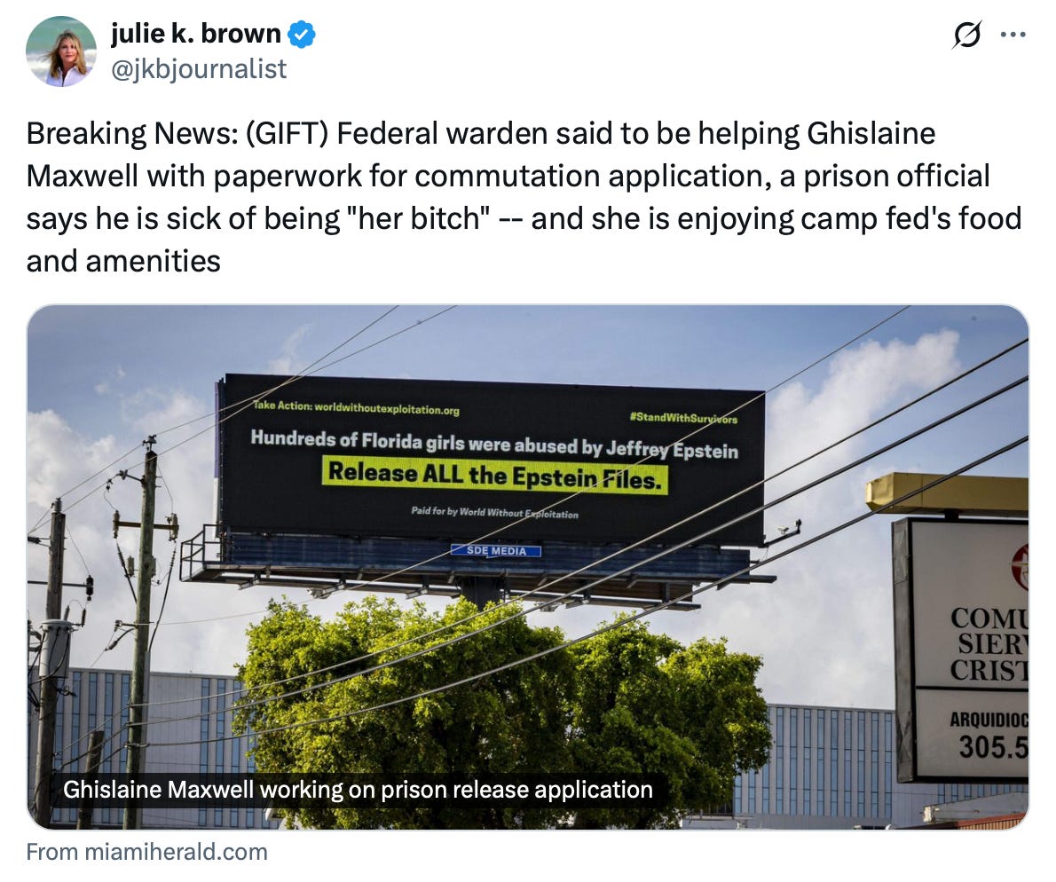 I’ve followed this case for years. Today, the nation’s leading Epstein reporter, Julie K. Brown, published a deeply sourced piece that makes one thing clear - this human trafficking sex offender is now being given a red‑carpet commutation push from inside federal custody.