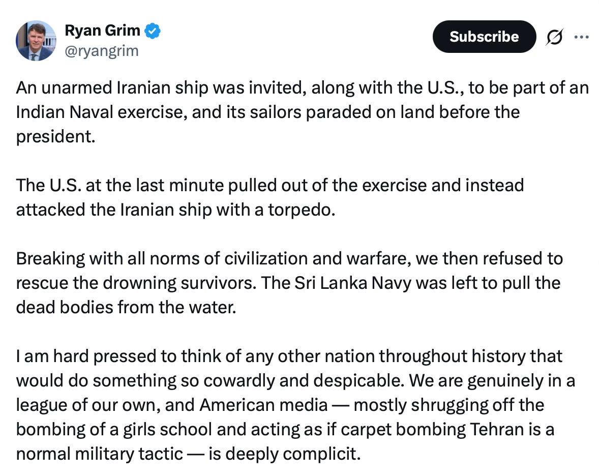 Ryan Grim wrote on X that the Iranian ship was invited, alongside the U.S., to the Indian naval exerciseâand then the U.S. pulled out at the last minute and torpedoed it.