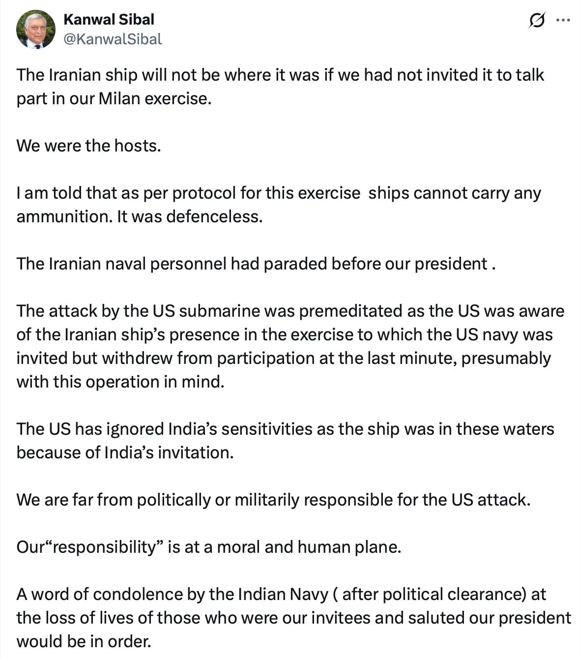 A former Indian foreign secretary, Kanwal Sibal, wrote that the ship would not have been there if India had not invited it, and he added the claimâattributed to what he said he had been toldâthat ships in the exercise could not carry ammunition.