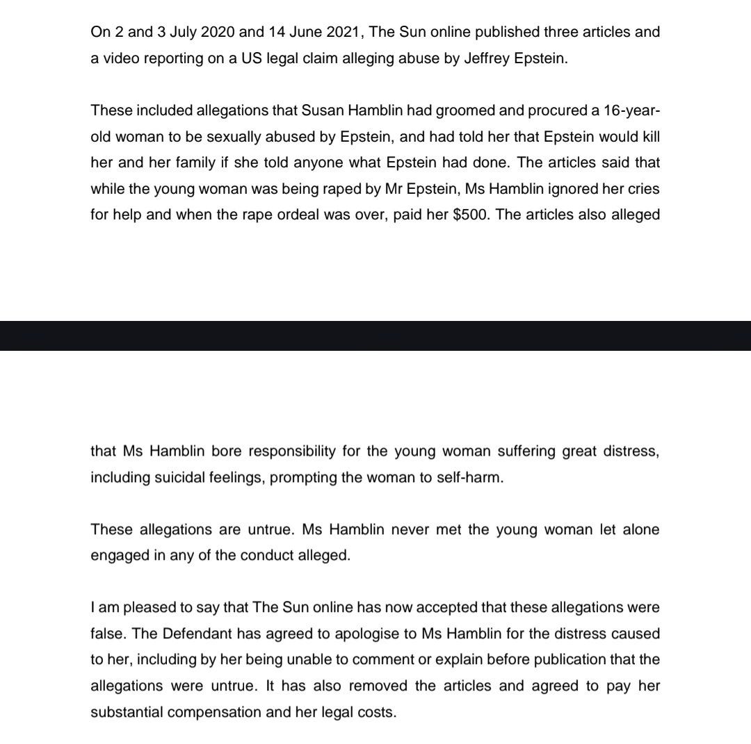 Thirdly, 6 years ago, SUN, the British tabloid, actually ran three stories on the mysterious Susan Hamblin and her close connections to Jeffrey Epstein, but she sued them to have the stories removed. She said SUN made them up, didn’t have the proof, and the courts ruled in her favor. They had to remove the stories and pay her - but they didn’t have access to the emails we now have access to.