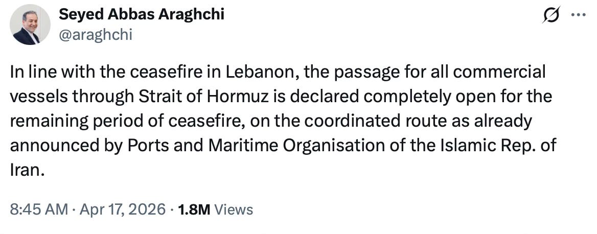 Iran’s foreign minister did not make a vague statement about peace. He said the passage for commercial vessels through the Strait of Hormuz was open “in line with the ceasefire in Lebanon.” That wording matters.