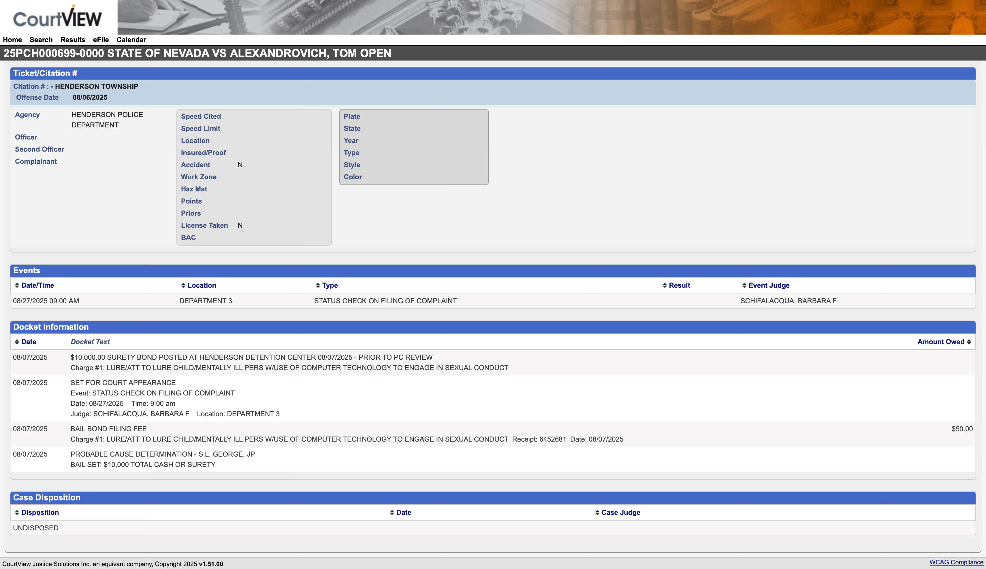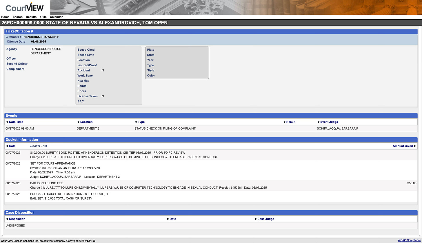 STATE OF NEVADA VS TOM ALEXANDROVICH, Case # 25PCH000699-0000 (OPEN CASE). You can see them yourself here.