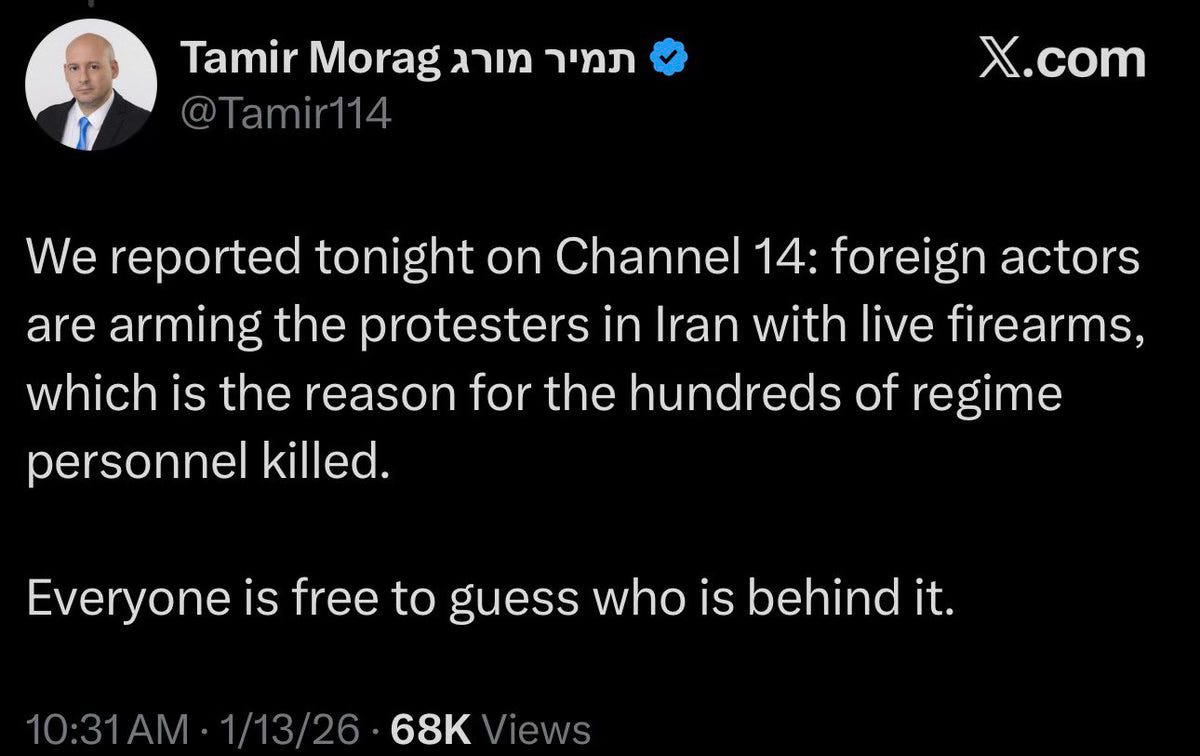 “We reported tonight on Channel 14: foreign actors are arming the protesters in Iran with live firearms, which is the reason for the hundreds of regime personnel killed.”