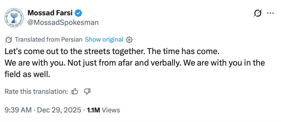 December 29th, 2025 — Mossad’s Persian-language spokesperson account posted (via X’s on-screen translation):