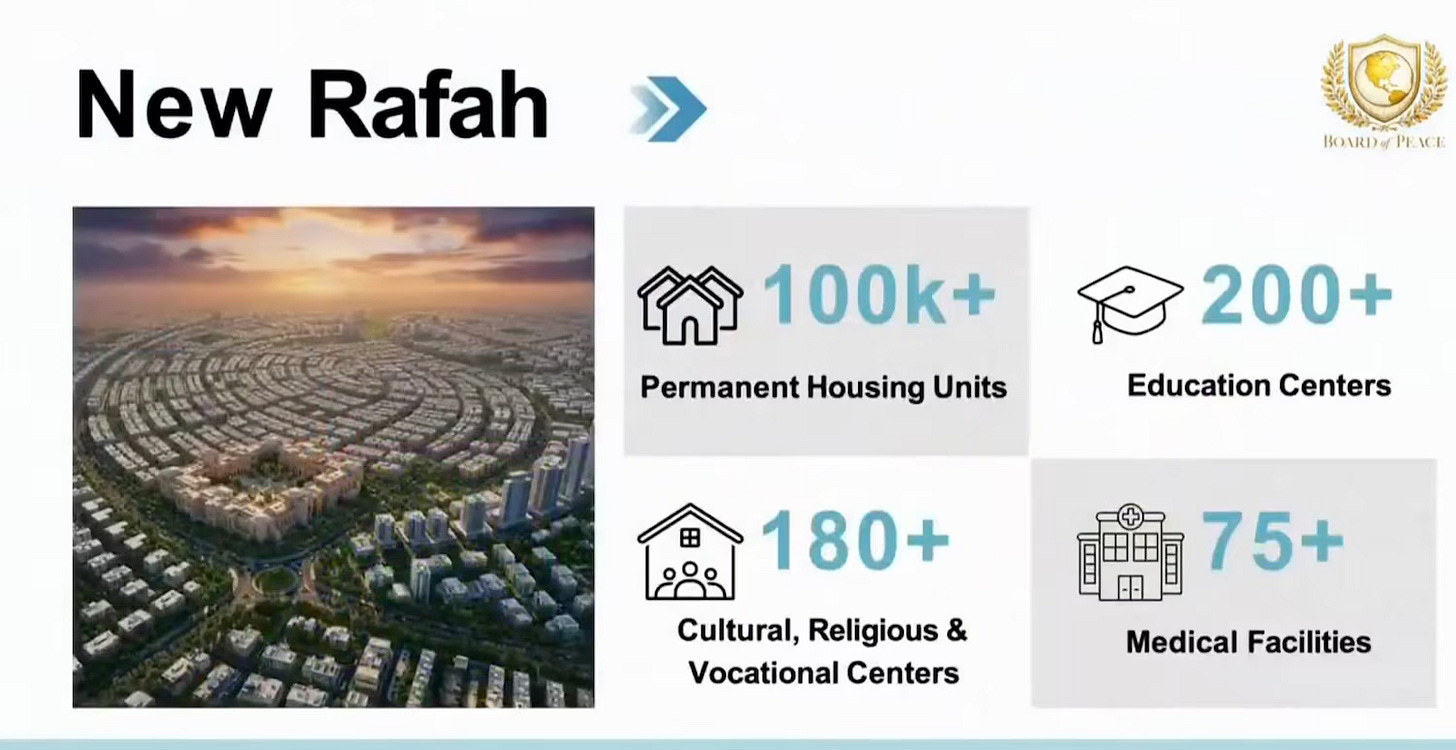 One slide literally breaks âNew Gazaâ into glossy investor categories: âCoastal Tourism,â âTransportation Hub,â âEnergy & Digital Infrastructure.â Another slide lists âNew Rafahâ in pure metrics like itâs a consultant brief: 100,000+ permanent housing units, 200+ education centers, 180+ cultural/religious/vocational centers, 75+ medical facilities. Another map zones Gaza like itâs being auctioned off, including a tourism coast designed for â180 towersââwhile the coastline is where displaced Palestinians are currently sheltering.