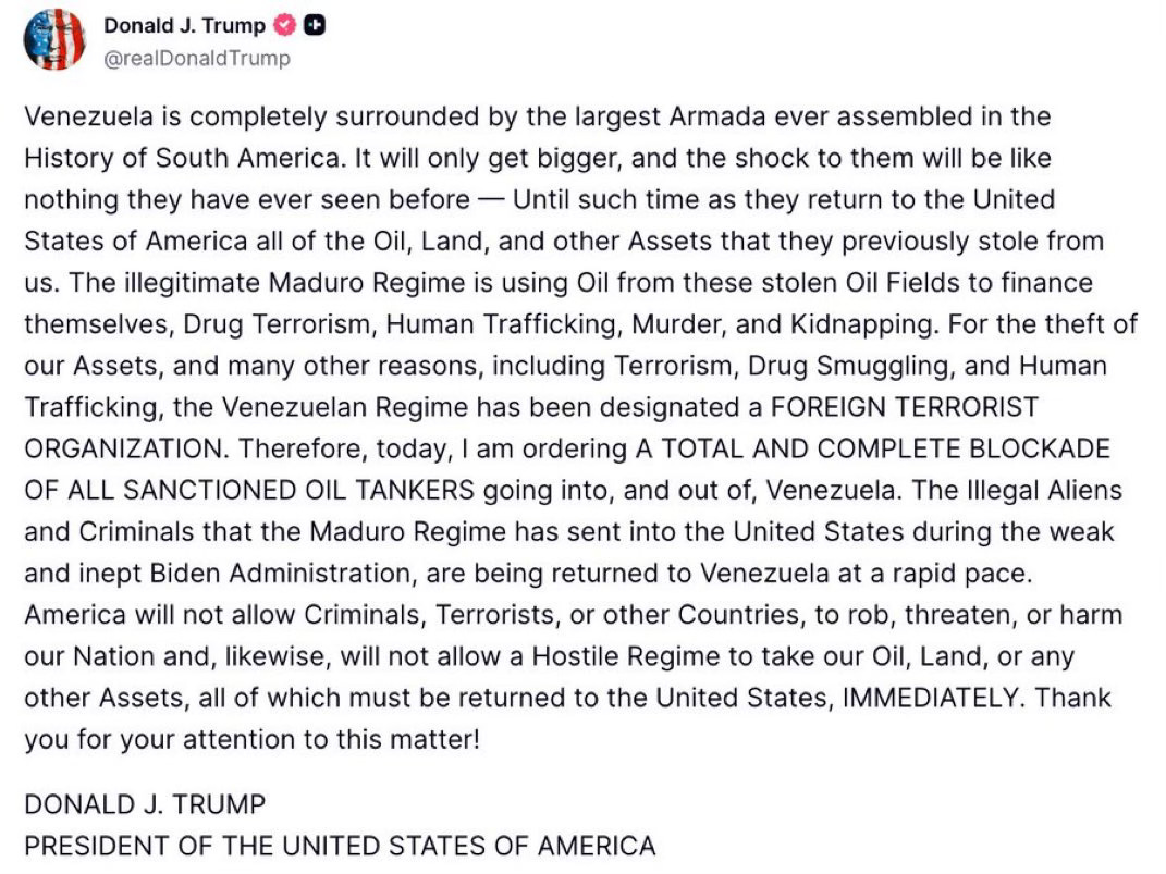 He wrote that Venezuela must “return to the United States” “all of the Oil, Land, and other Assets” it supposedly “stole from us.” He labeled the Maduro government a “foreign terrorist organization.” He bragged that Venezuela is surrounded by an armada “like nothing they have ever seen before.” And then he announced a “TOTAL AND COMPLETE BLOCKADE” of oil tankers going into and out of Venezuela.