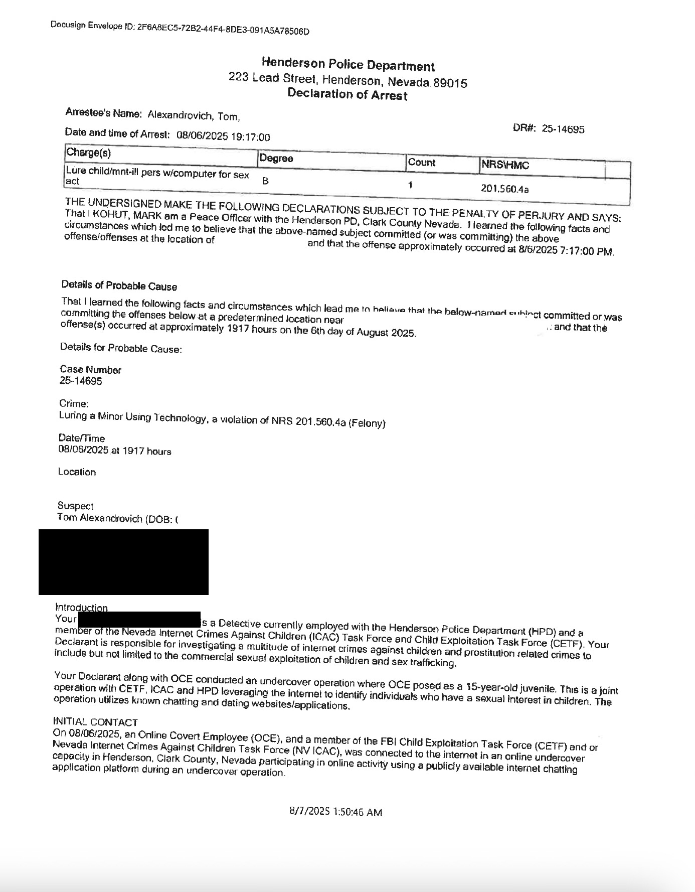 The document is chilling. It states clearly that on August 6, 2025, at 7:17 PM, Alexandrovich was taken into custody by Henderson Police in cooperation with the FBI’s Child Exploitation Task Force and Nevada’s Internet Crimes Against Children Task Force.