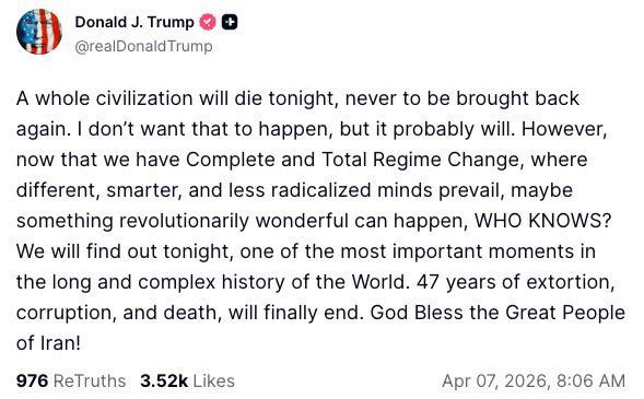 Trump just posted words so obscene, so bloodless, and so openly evil that I had to read them twice to make sure I wasn’t imagining it. He wrote that “a whole civilization will die tonight, never to be brought back again,” then pivoted almost casually into talk of “Complete and Total Regime Change” and the possibility that “something revolutionarily wonderful can happen.”