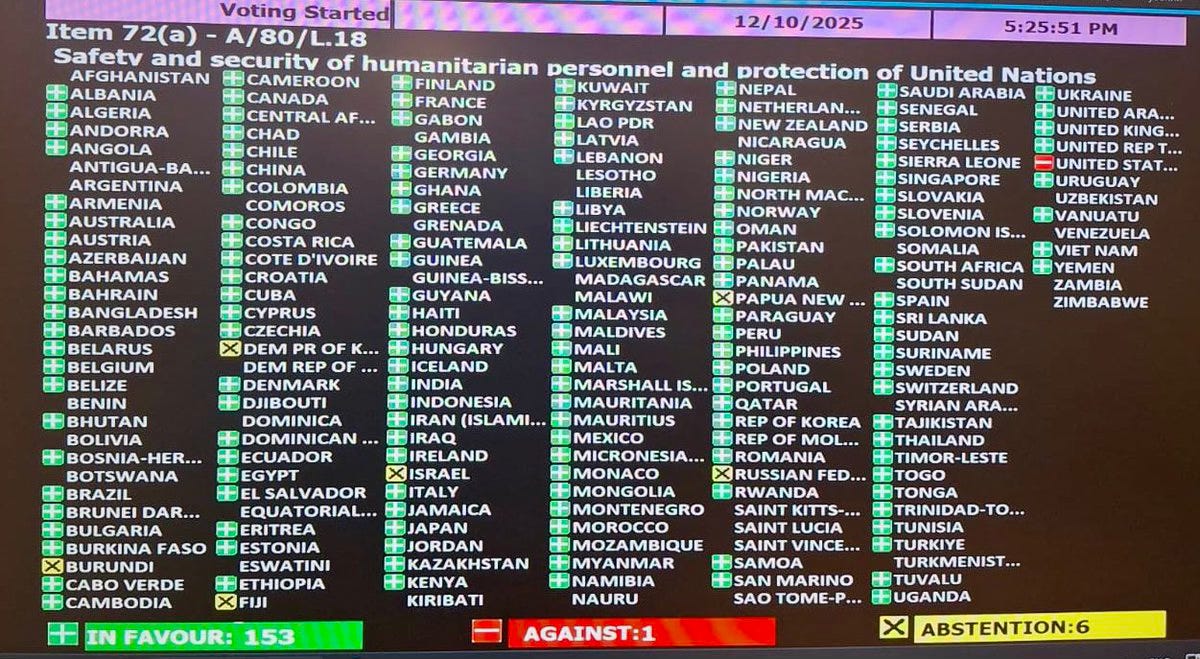 Not because a tweet said it. Not because a foreign government claims it. Because in a 153â1 vote to protect UN personnel, America stood alone. Thatâs not âleadership.â Thatâs not âvalues.â Thatâs not âdemocracy.â That is moral collapse with a flag on it.