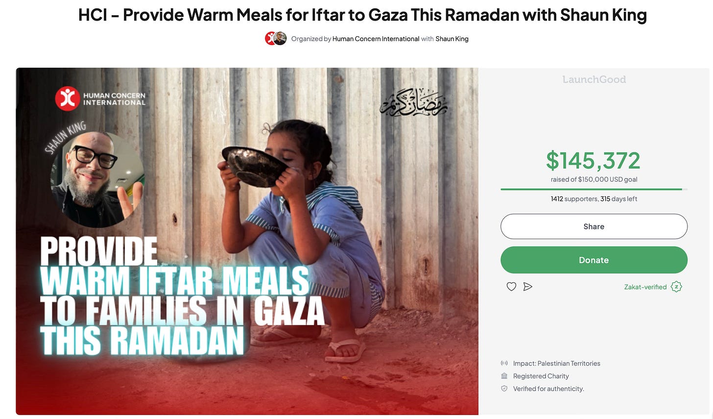 We just won a $5,000 bonus for Gaza Iftar meals—Alhamdulillah. We’re at $145,372 and trying to blow past $150,000 tonight, but our real goal is $1.5M this Ramadan. It’s Zakat-eligible + tax-deductible and Shaun takes $0. Please donate: https://www.launchgood.com/v4/campaign/support_the_people_of_gaza_this_ramadan_w_shaun_king