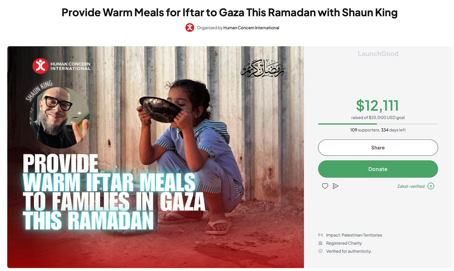 I do not take a percentage or a single penny from this fundraiser. 0.00%. Not now. Not ever. Every dollar goes to Human Concern International (HCI) for meals in Gaza.