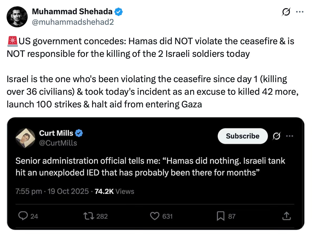 Because this is the playbook. Bomb Gaza into a field of unexploded ordnance, send demolition crews into that minefield, blame Hamas when something blows, and use the panic to cut off aid and re-ignite airstrikes. Then, once Washington says the quiet truth in private, tweak the posture without ever telling the public what really happened.